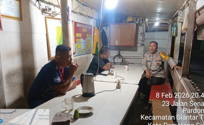 Pematangsiantar !!! Berita Terang.com -Polsek Siantar Timur Polres Pematangsiantar melalui piket Bhabinkamtibmas AIPTU Okto S dan AIPDA G. Sinaga melaksanakan kegiatan Saling (Sapa Poskamling) di Poskamling Jalan Senangin Kelurahan Pardomuan Kecamatan Siantar Timur Kota Pematangsiantar, pada Minggu ( 08 / 02 / 2026 ) malam pukul 20.35 WIB.