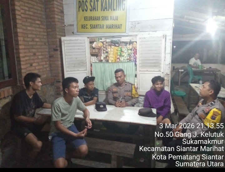 Pematangsiantar !!! Berita Terang.com -Polsek Siantar Marihat Polres Pematangsiantar melalui Kanit Intelkam IPDA Edison Sitohang bersama piket Bhabinkamtibmas AIPDA Erik Marbun, AIPDA P. Butar Butar dan AIPDA A Manurung melaksanakan Saling (Sapa Siskamling) di Pos Kamling Jalan Durian Kelurahan Suka Maju Kecamatan Siantar Marihat Kota Pematangsiantar, pada Selasa ( 03 / 03 / 2026 ) malam sekira pukul 21.00 Wib.