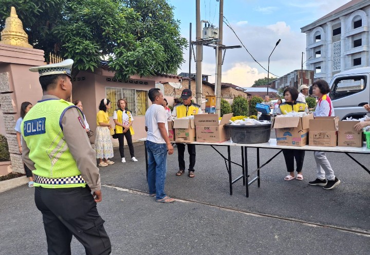 Pematangsiantar !!! Berita Terang.com -Satuan Lalu lintas (Sat Lantas) Polres Pematangsiantar melaksanakan pengaturan arus lalu lintas (Gatur Lalin) pembagian takjil di depan Vihara Vidya Maitreya Jalan Ade Irma Suryani Kelurahan Melayu Kecamatan Siantar Utara Kota Pematangsiantar, pada Minggu ( 15 / 03 / 2026 ) sore sekira pukul 17.00 Wib.