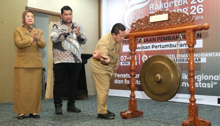 Rakortekrenbang dibuka dengan pemukulan gong oleh Wesly didampingi Dikky Anugerah dan Kepala Bappeda Kota Pematangsiantar Sofie Megawaty Saragih, SST, MSi.